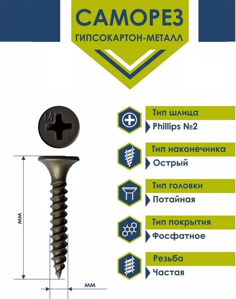 Фосфатированные саморезы с острым наконечником предназначены для монтажа гипсокартонных листов к металлическим профилям. Резьба частая с крестообразным шлицем Phillips №2. Наличие потайной головки позволяет полностью "утопить" саморез в материале. Благодаря этому, саморезы ГКМ идеально подходят для финишной декоративной отделки.