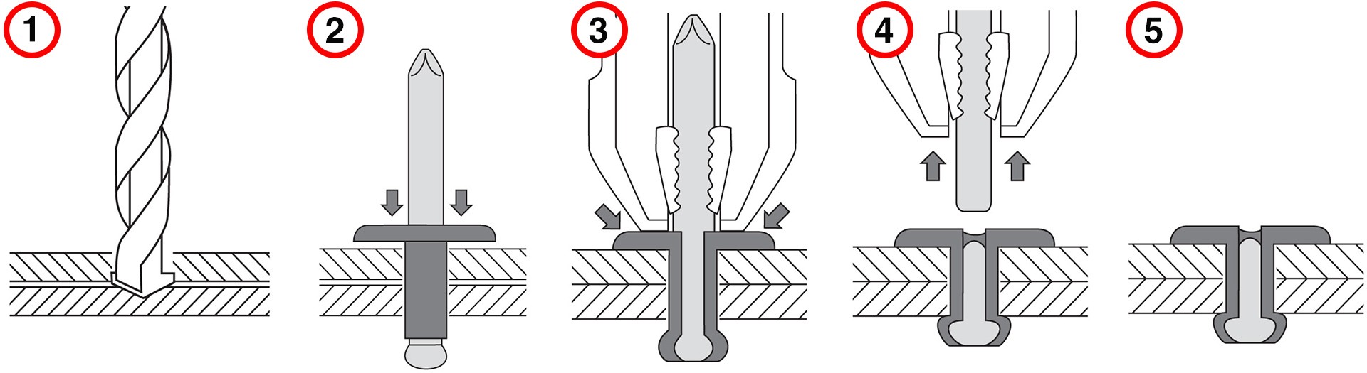 Вытяжные заклепки - вид крепления материалов имеет значительные преимущества перед другим крепежом. Они обеспечивают идеальную стыковку металлических деталей в случае, если не предполагается разборка соединения. Этот экономичный способ применяется и при скреплении дерева и мягких материалов, для чего используют широкий буртик. Рассматриваемая крепежная принадлежность состоит из шляпки, стержня (сердечника) и гильзы.