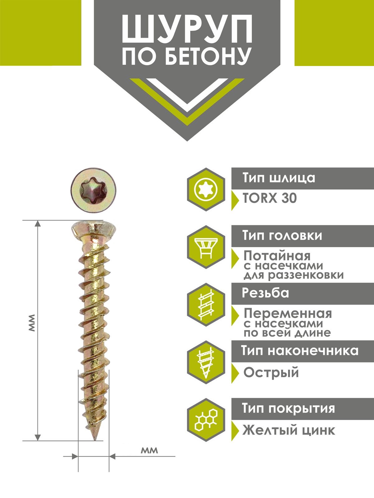 Шуруп по бетону (нагель) является отличным решением при креплении конструкций из дерева, пластика или тонкого металла к основанию из бетона или кирпича, иногда газобетона, а так же натуральному камню. Головка у самореза потайная со шлицем TORX, резьба двухзаходная различной величины, острый на конце. При использовании требует предварительного сверления отверстий буром 6мм, т.к. у всех нагелей диаметр 7,5мм. После применения головку самореза в конструкции скрывают с помощью декоративных колпачков различных цветов, для общего эстетичного вида.